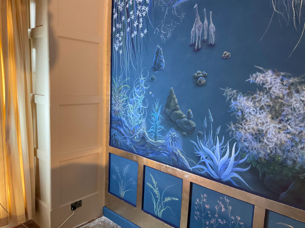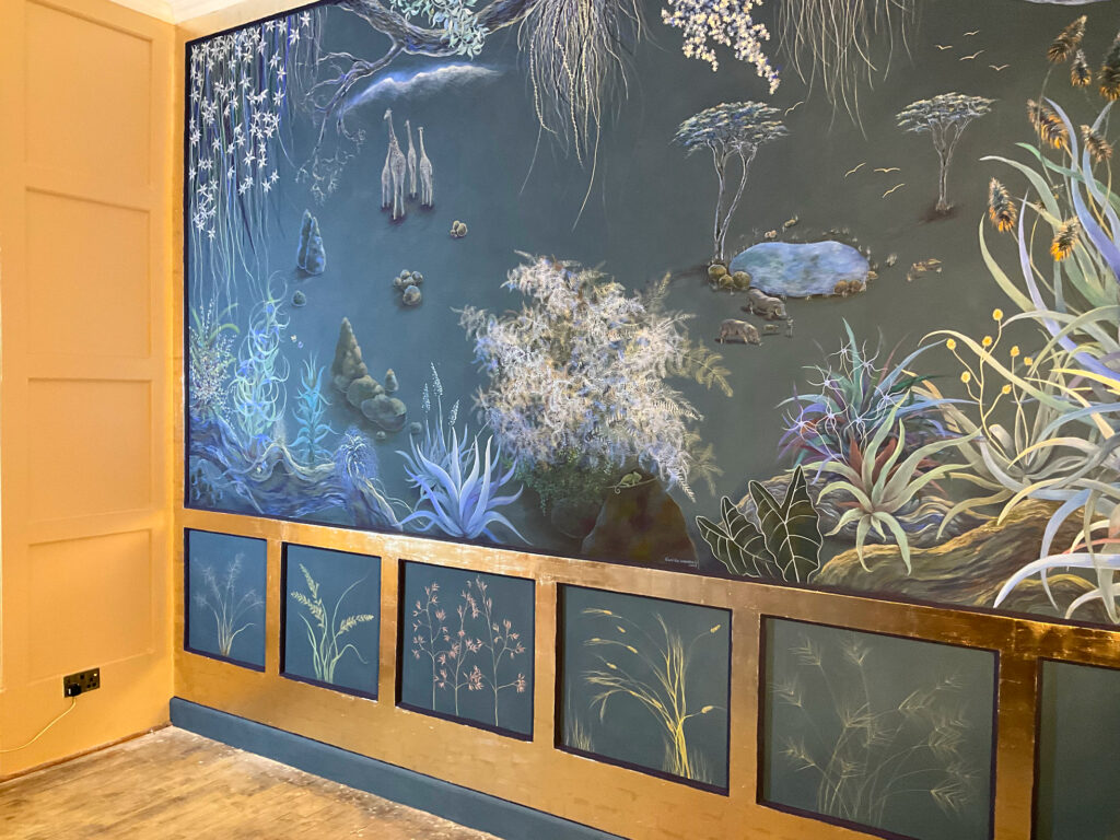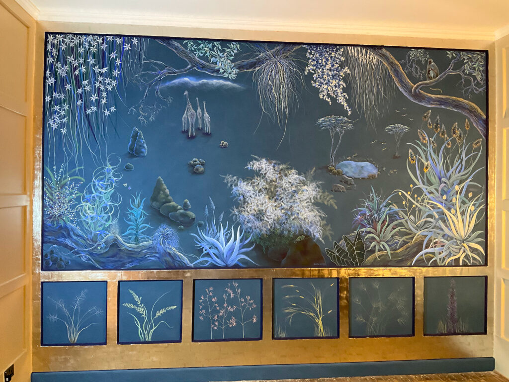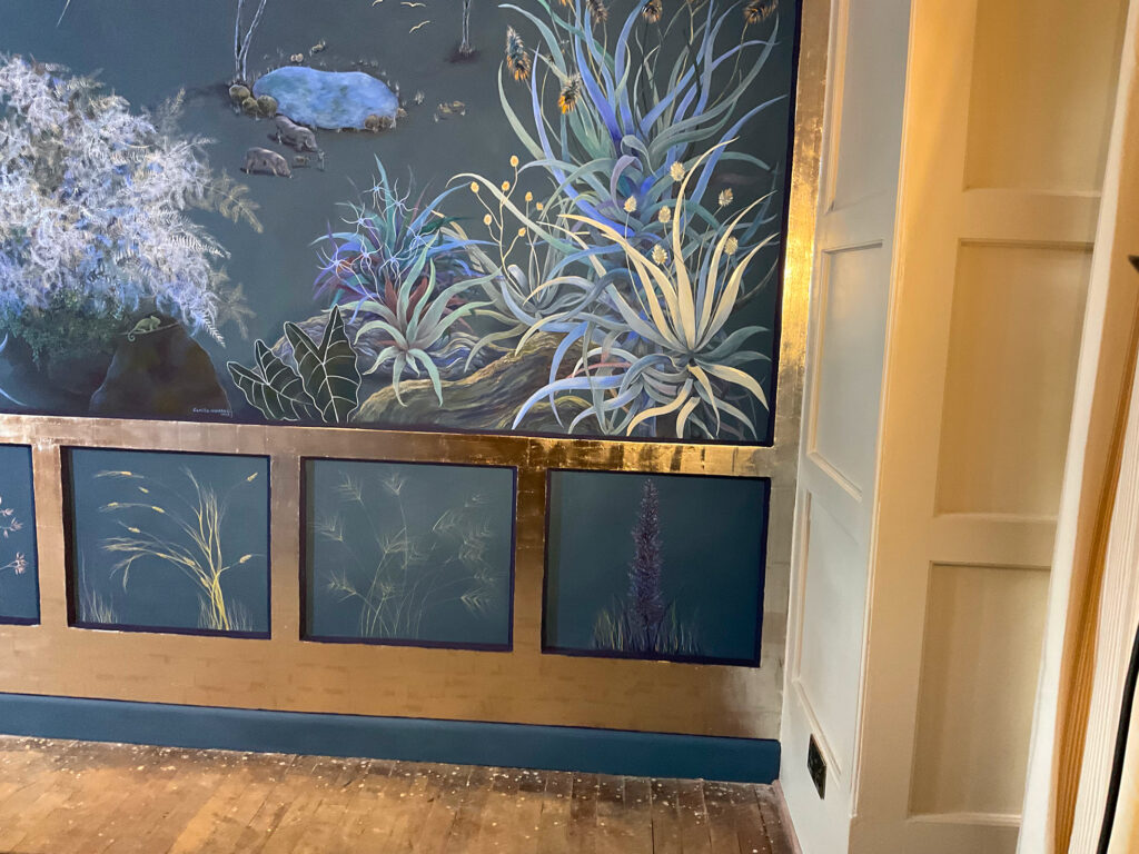 The mural is part real, part surreal, a world that balances between dream and memory, finished with soft touches of platinum leaf that glint like starlight after dusk.
